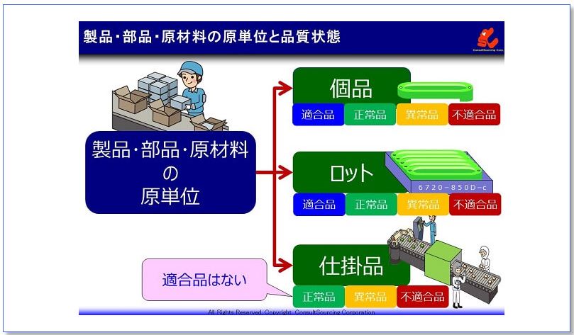 品質の状態を識別したり、管理したりする場合、個品に対する品質状態と、ロットに対する品質状態を分けて考える必要があります。