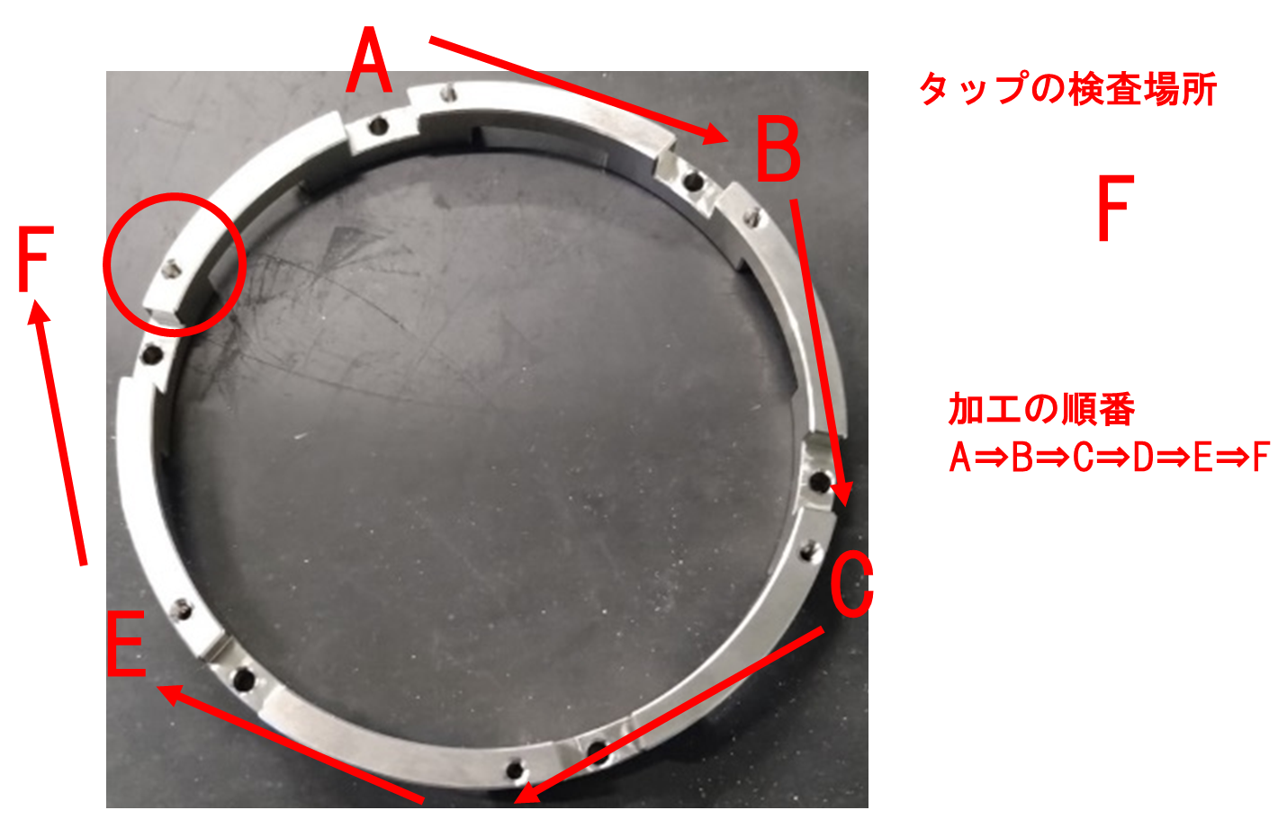加工の順番がA⇒B⇒C⇒D⇒E⇒Fのとき、最後のタップ F を測定する事が、この製品の保証をした事になります。