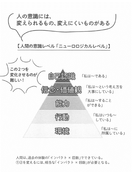 そのなかでも、特に変化させるのがたやすくないのは、① 「アイデンティティ(自己認識)」と② 「信念・価値観」です。人そのものや価値観を外的な力で変えるのは非常に困難を伴うものです。