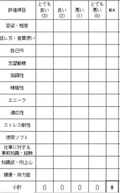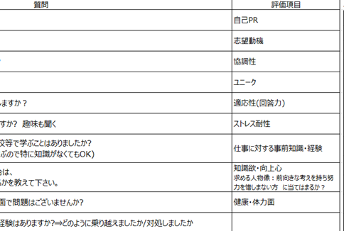 新卒の面接時、質問する内容でどの評価項目にあたるかを設定しておき、その質問の回答で点数をつけるようにしています。