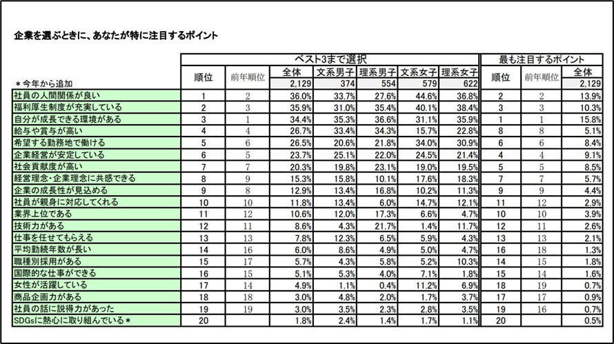 学生が企業を選ぶときに重視するポイントで、「経営理念・企業理念に共感できる」が上位の理由が分かりませんでしたが、自分の価値観とマッチしているか判断する為上位であることが分かりました。