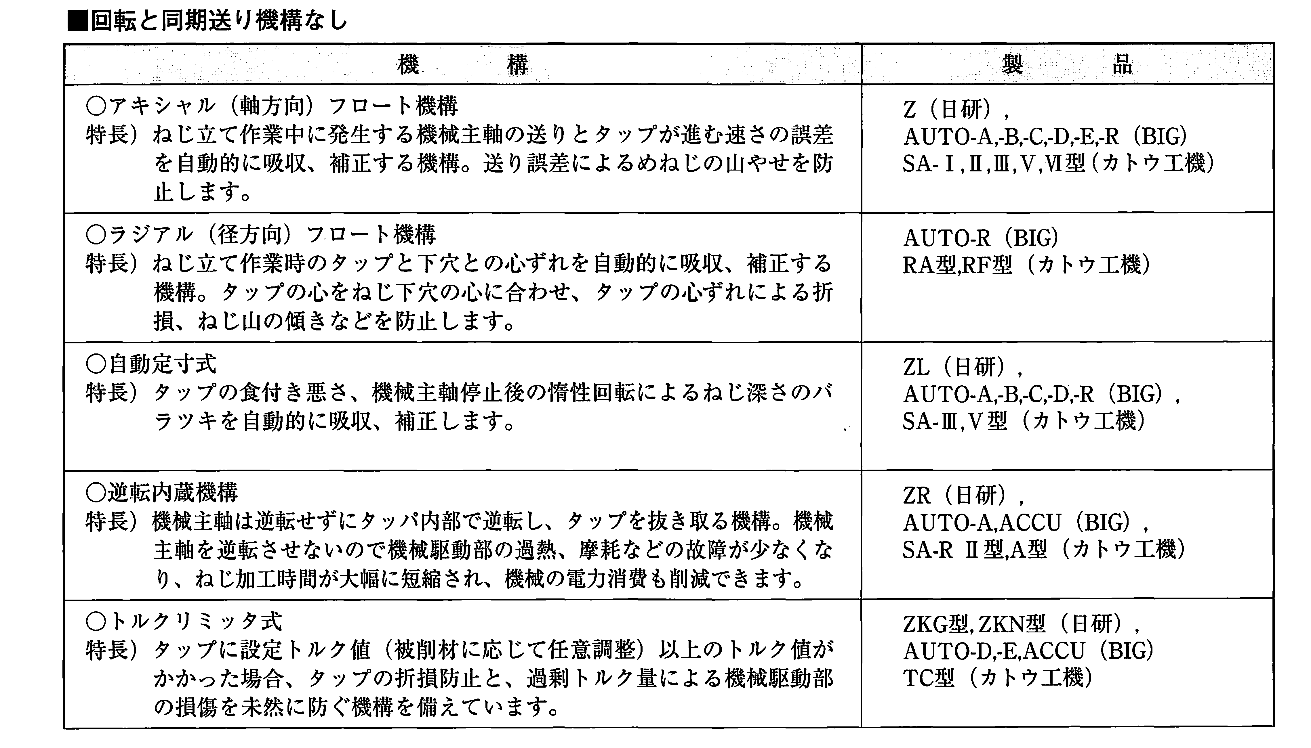 タップの性能を十分発揮させるにはホルダは重要な要素となります。機構別に分類すると固定式と浮動式(軸方向のみ、横方向のみ、軸横両方向の3種類)がありますが、タップと下穴の心ずれが発生しやすい場合は浮動式が使用されます。