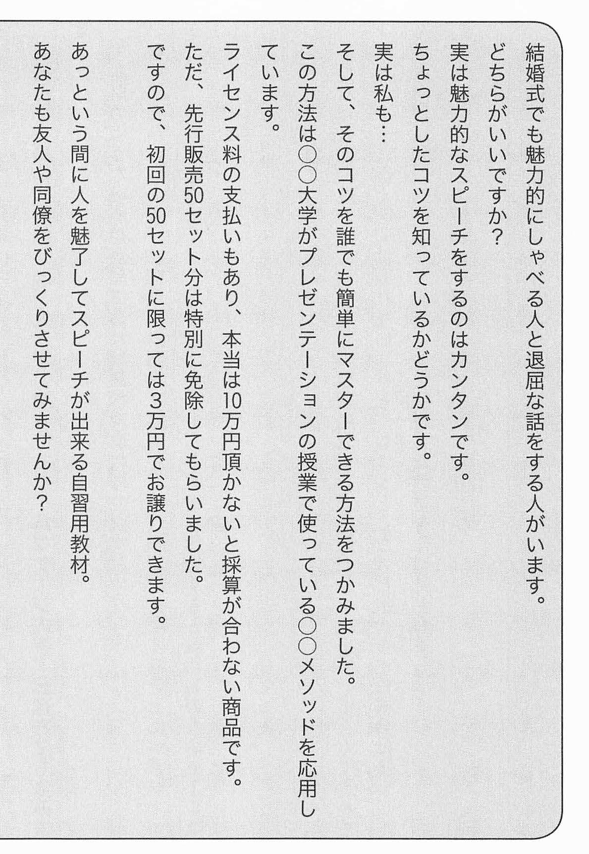 あなたは人前で魅力的に話すための自習用教材を通信販売しています。忙しくてカルチャーセンターに行く時間は取れない。