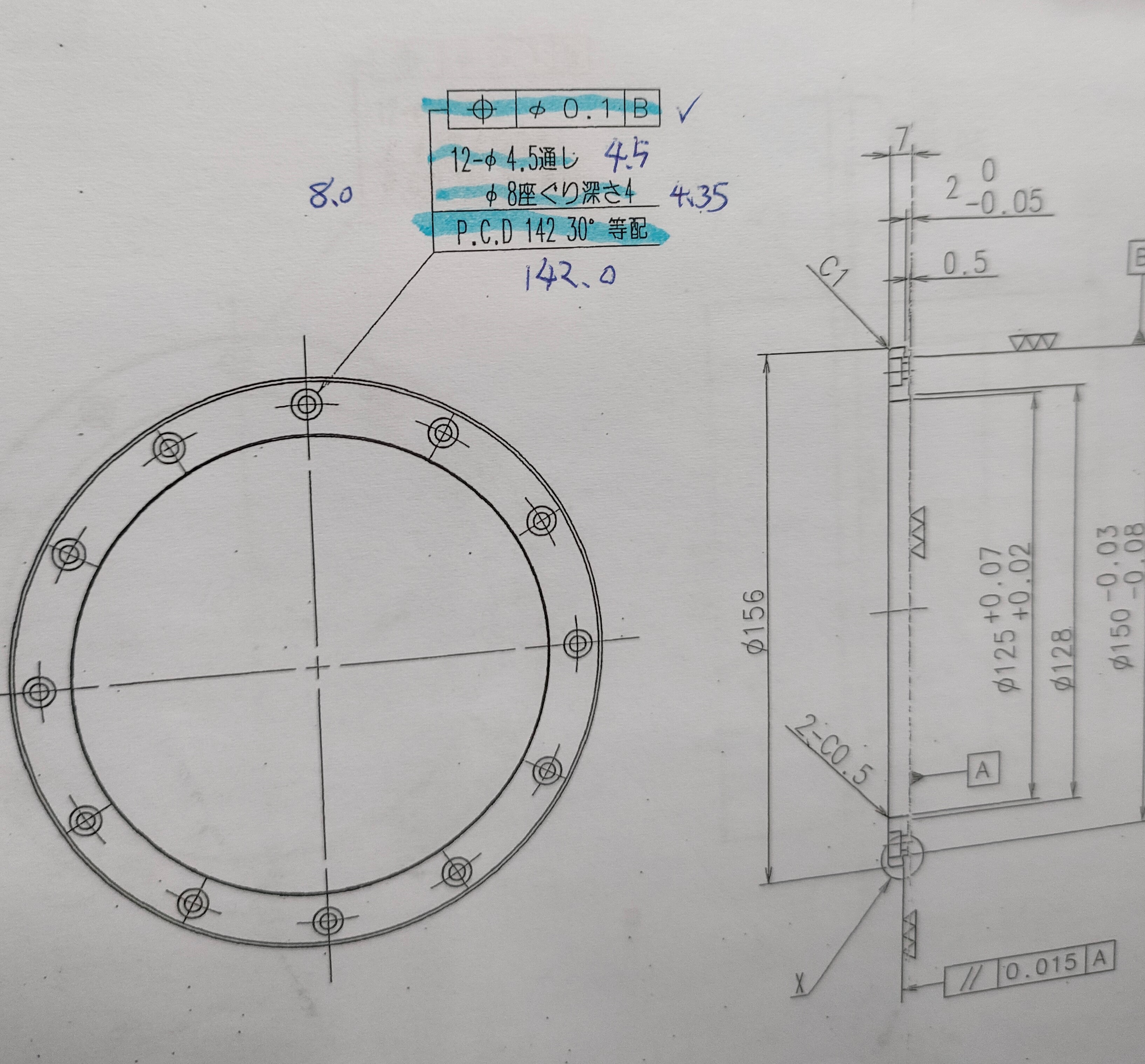 製品に穴をあけます。又、座グリ穴をあけます。図面にはφ4.5通し、φ8座グリ深さ4と書かれたりします。