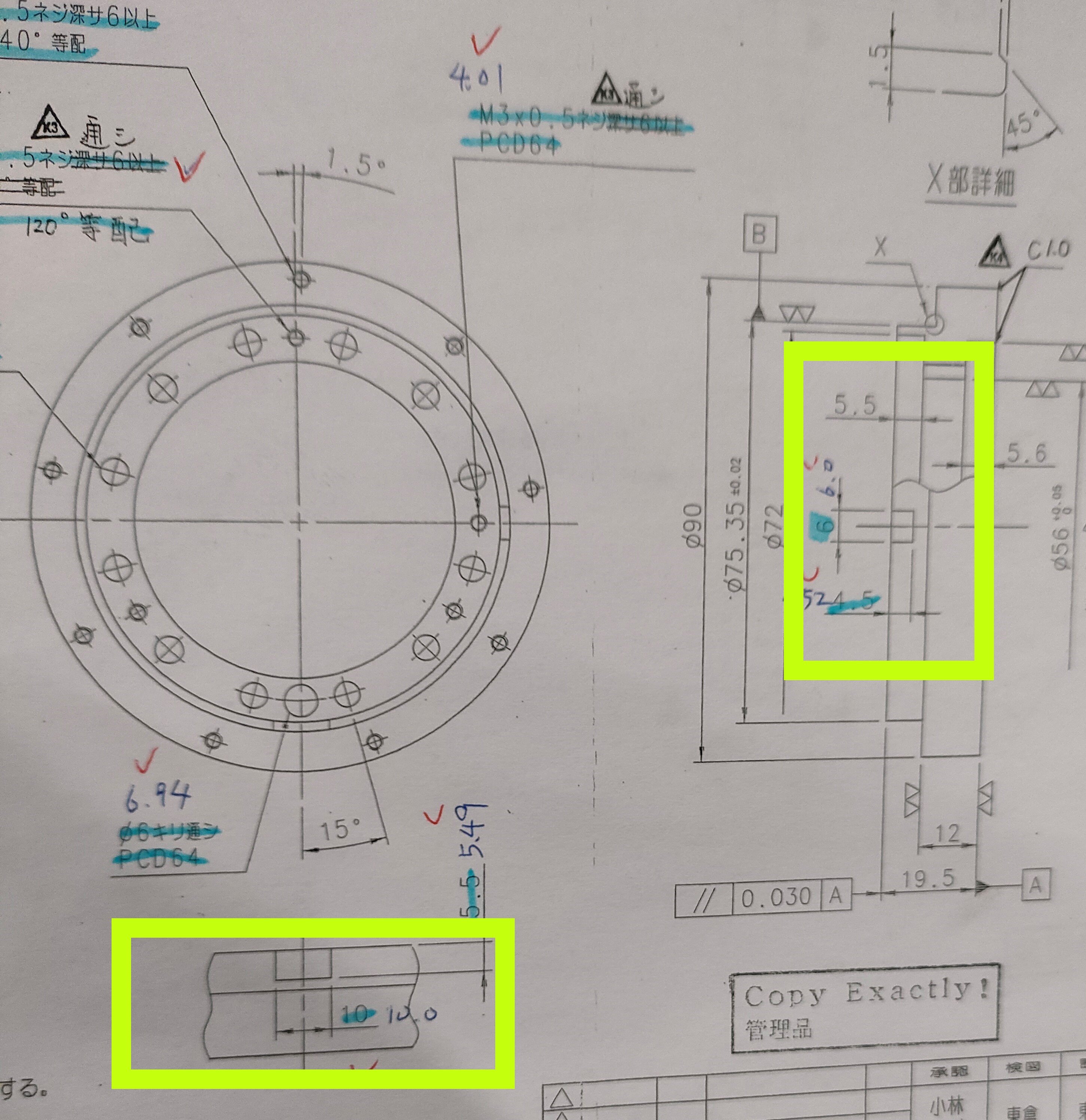 指示無き各部C0.5や糸面取り、と図面に記載される。