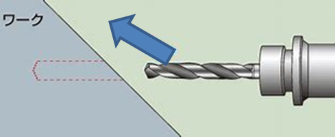 加工面がナナメの場合、下の図の矢印の方向にこちらもナナメに穴が空いてしまいます。