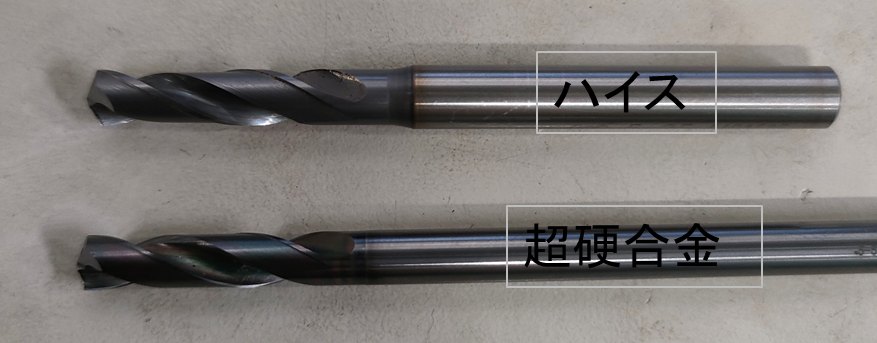 剛性の高いドリル材質を選ぶことで、穴の曲がりを防止することが可能です。一般的にドリルはハイスが多いですが、ハイスに比べ剛性の高い超硬合金を採用したドリルを使用します。又はドリルの刃長の短い物(EX-GDS)にするなどします。