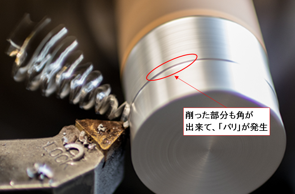 切削とは「削る」ことなので切っている訳ではありません。切り取られる部位が製品から離れていくときに塑性変形を起こしせん断されるので、粘土のように引き延ばされながら千切れた部分が突起となって残ります。金属は固いのでこれがバリとなります。