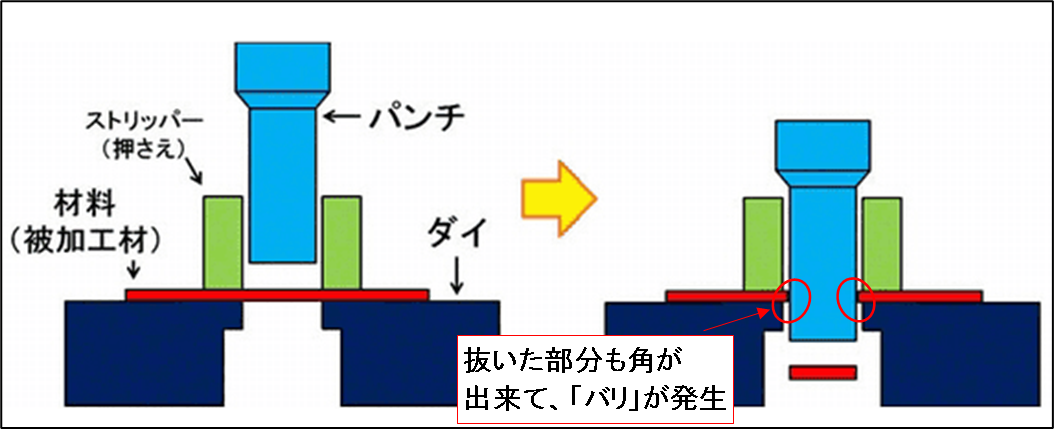 せん断加工時のバリは、基本的に素材の抜け側に発生します。