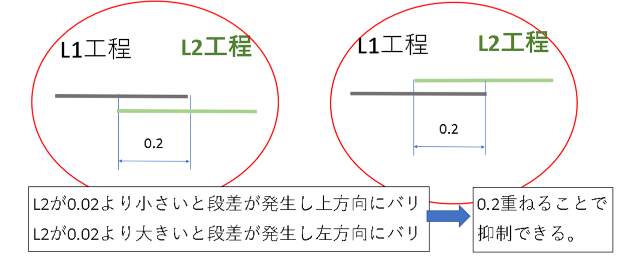 ここでバリの発生を抑えるために、プログラムで0.2 「両側から重ねる」部分をつくります。