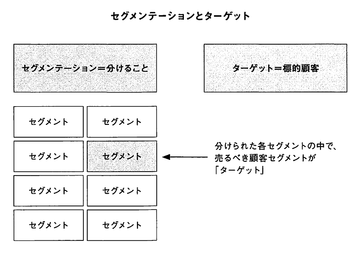 「常に正確な時刻が表示される」、「電池交換の手間が不要」というような機能的な価値を求める人には、例えばソーラー電波時計のような正確で電池交換不要な時計がいいだろう。デザインがいいにこしたことはないにしても、それよりは機能や価格の方が重要だ。逆に「スーツに合う」、「美しいデザイン」、「アクセサリーとしての価値」などを求める人は、とにかく見た目を重視した時計が欲しいと考えるだろう。顧客を分けることを「セグメンテーション」、分けられた顧客のグループを「セグメント」と呼ぶ。そしてどのセグメントを狙うか決め、この人たちに売ろうと狙いをつけた顧客を「ターゲット」とよぶ。