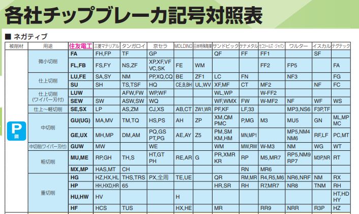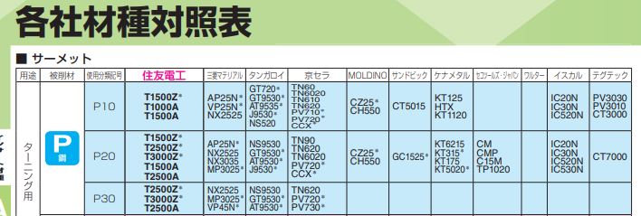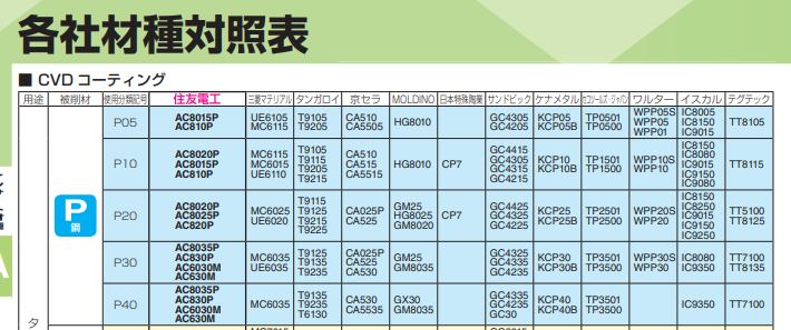 P種を削る材種を各メーカーが出していますが、横列はそのメーカー事の相当品という事です。