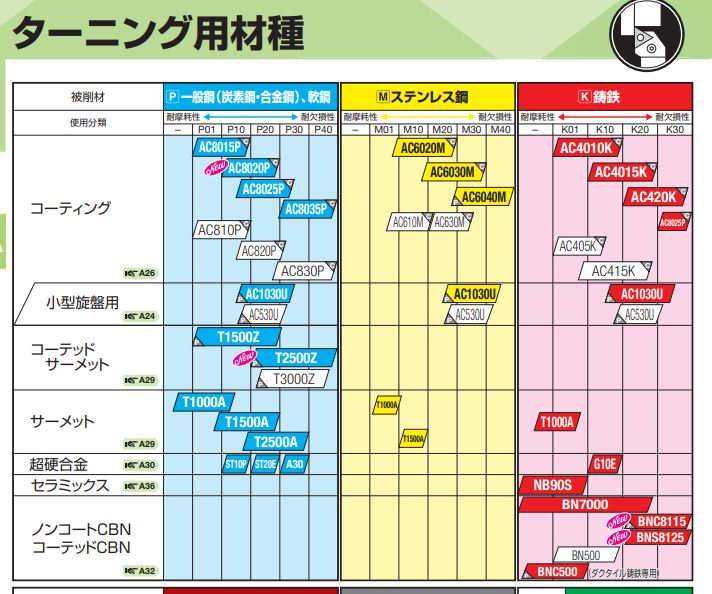 どの様に見るか説明すると、P種を削るサーメット材種はP10、P20、P30の3種類あり、P10が一番硬い、P30が一番柔らかい